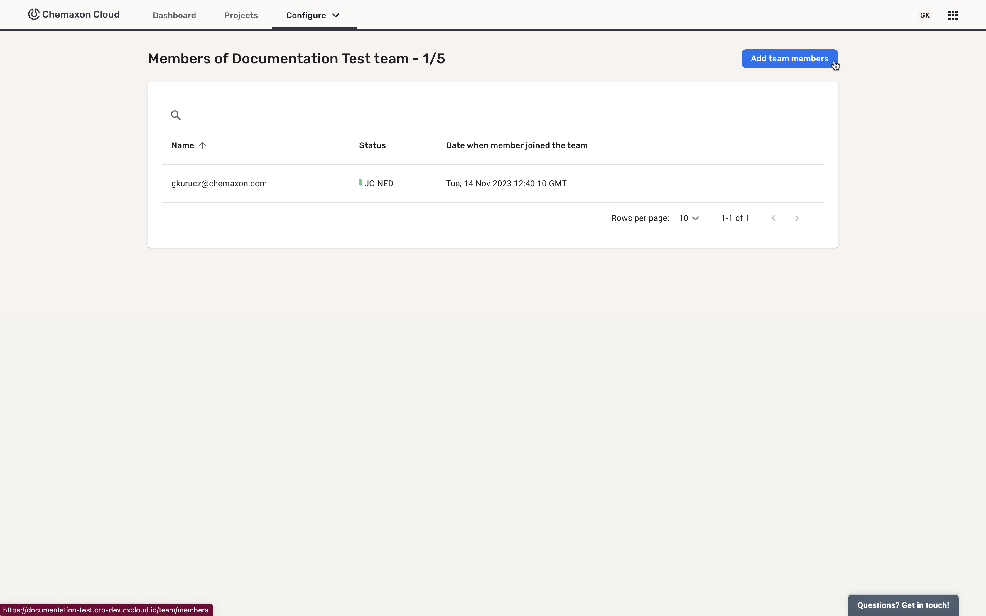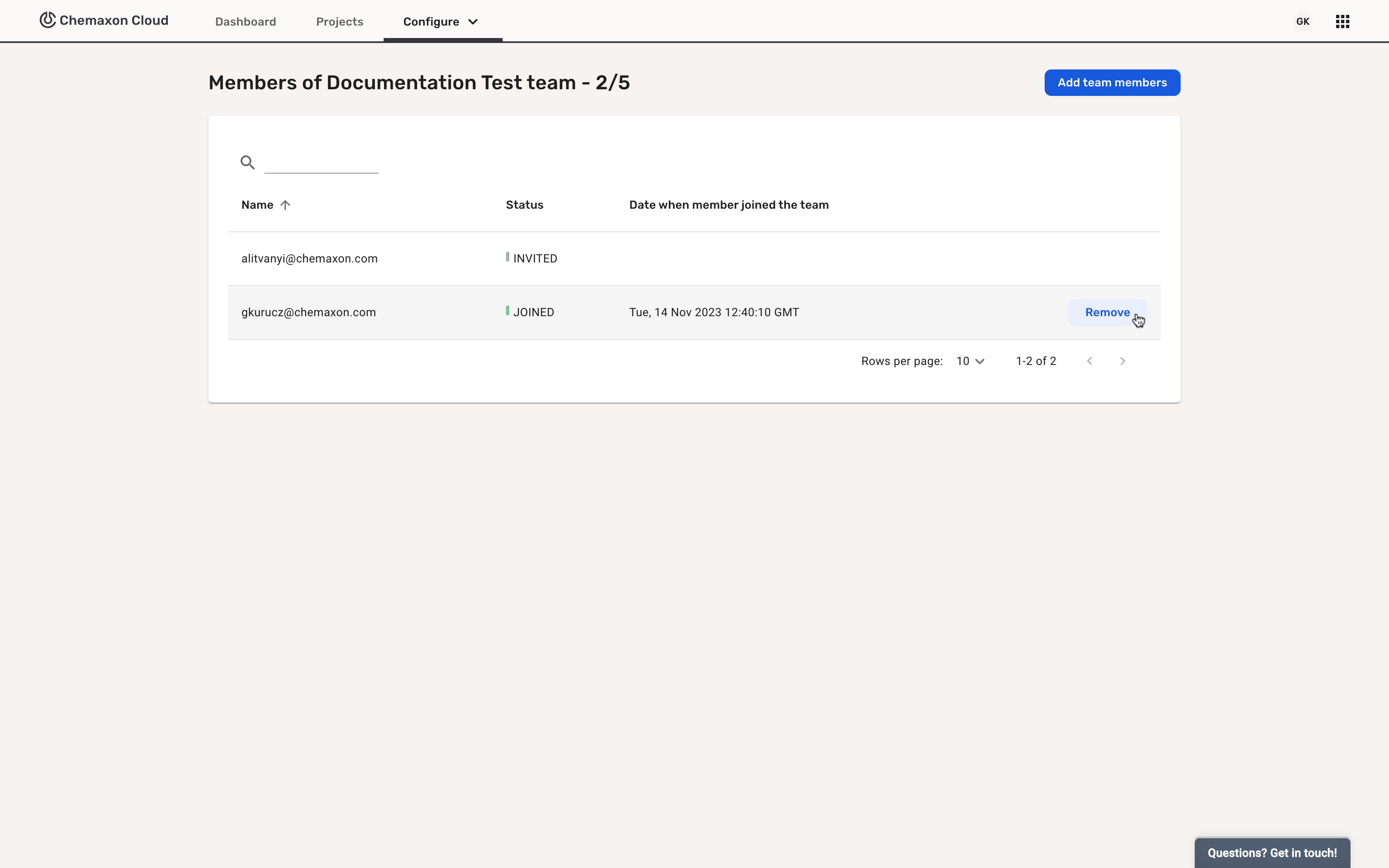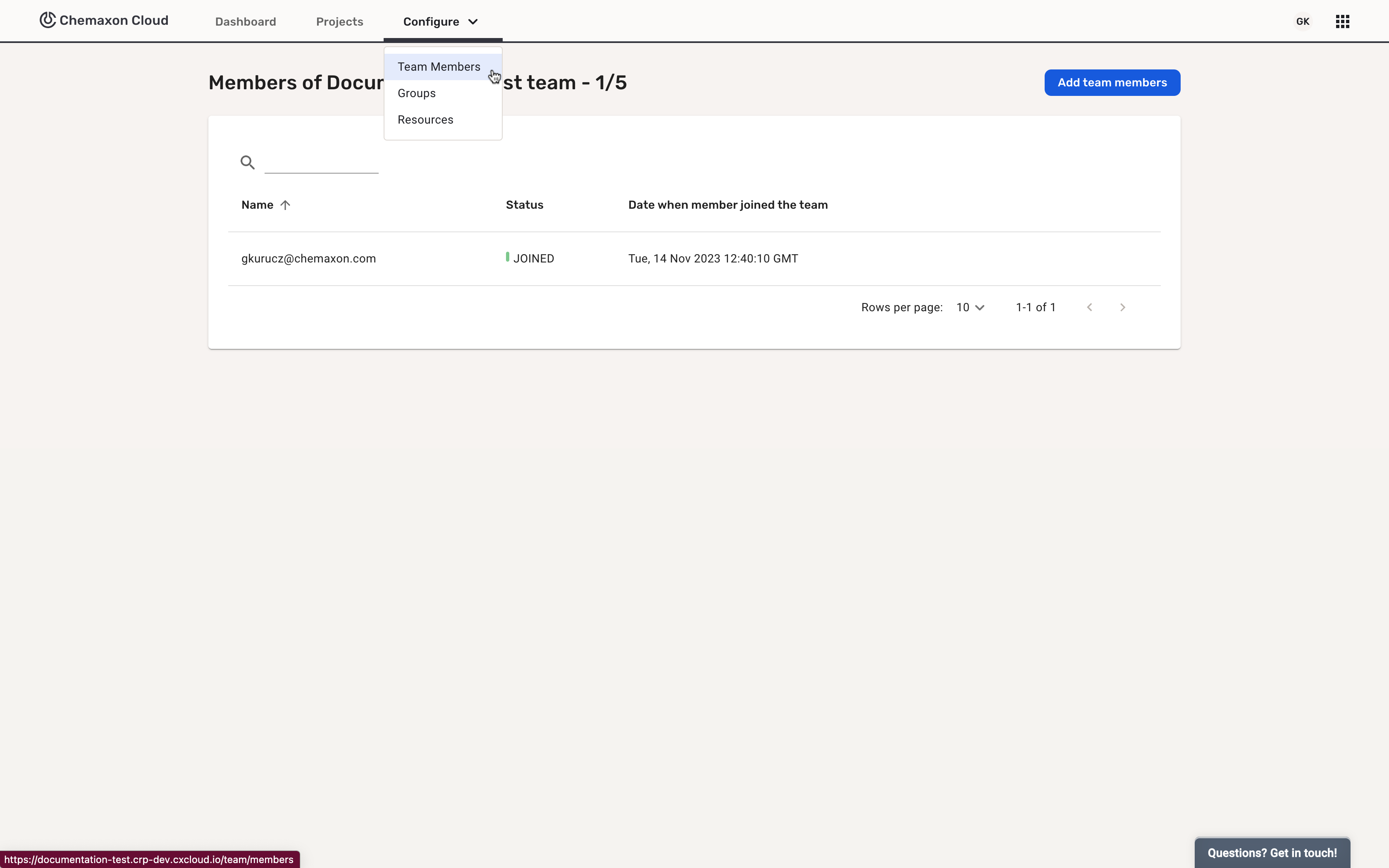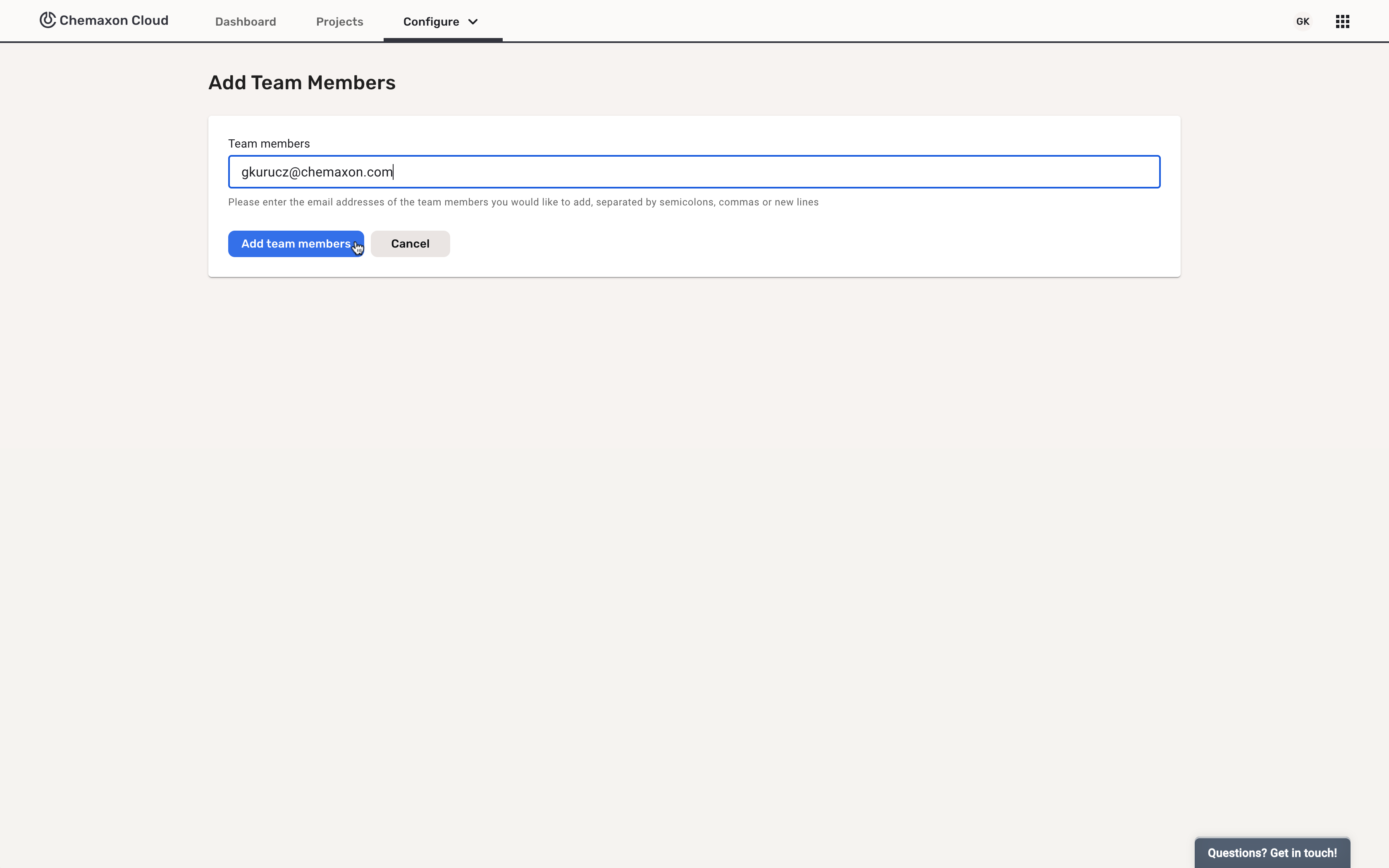 After logging in to Chemaxon Cloud, open the Configure dropdown and select Team Members: