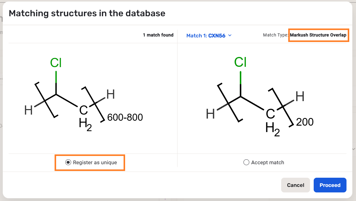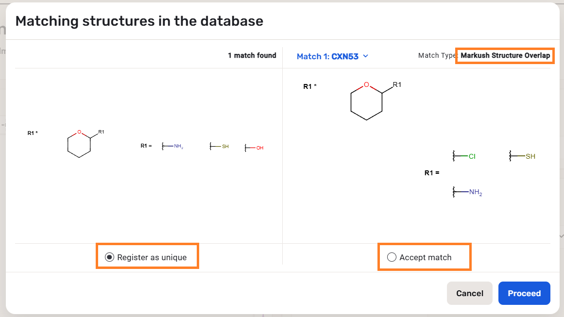 When registering using the Advanced Registration mode or from the Submission page (Staging area) the match list will be encountered if the registered Markush structure has matches in the DB. Two match types can be available: