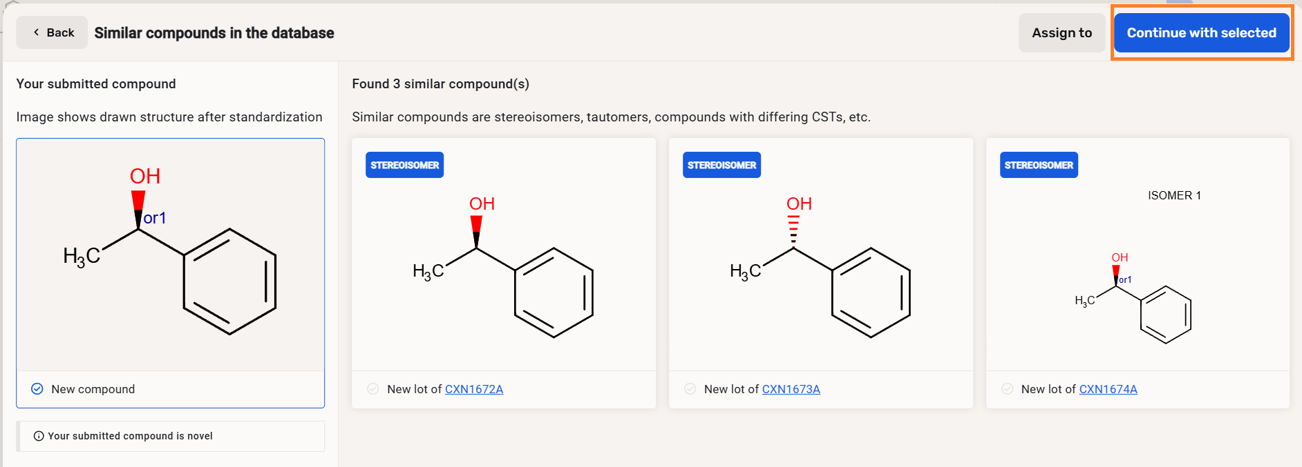 Consequently, after checking the "suggestions" from the database, the user can decide which structure should be chosen for registration, the drawn one can be kept, but other suggestions can be also selected. This list is the same as the one displayed in the case of an advanced mode registration, the only difference is the Register as selected button instead of the Continue with selected button.