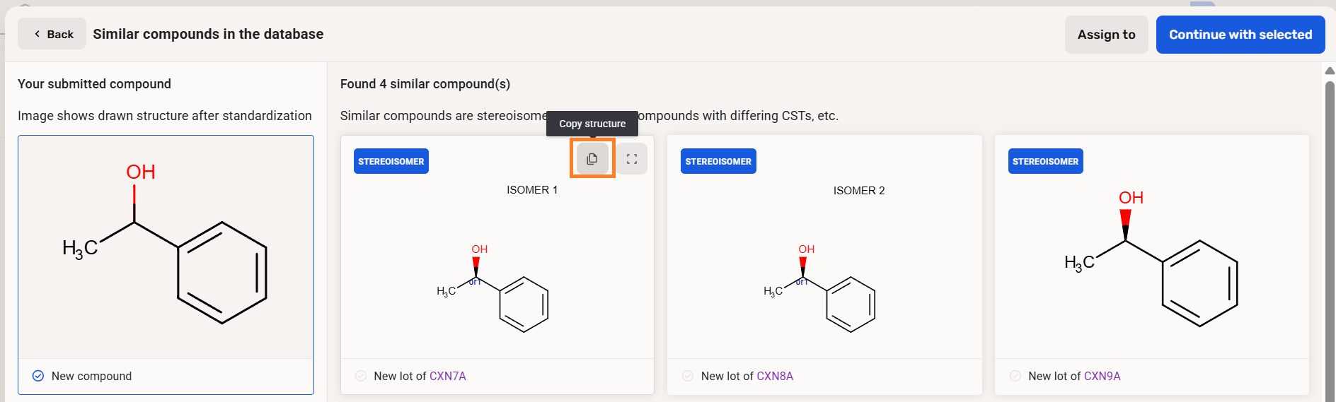 It is possible to copy to clipboard the 'Your submitted compound' or the found 'similar compounds' also. For this purpose please find the Copy structure icon in the top right corner. After clicking on this icon the structure is copied to the clipboard in molfile V3000 format and it can be pasted somewhere else.