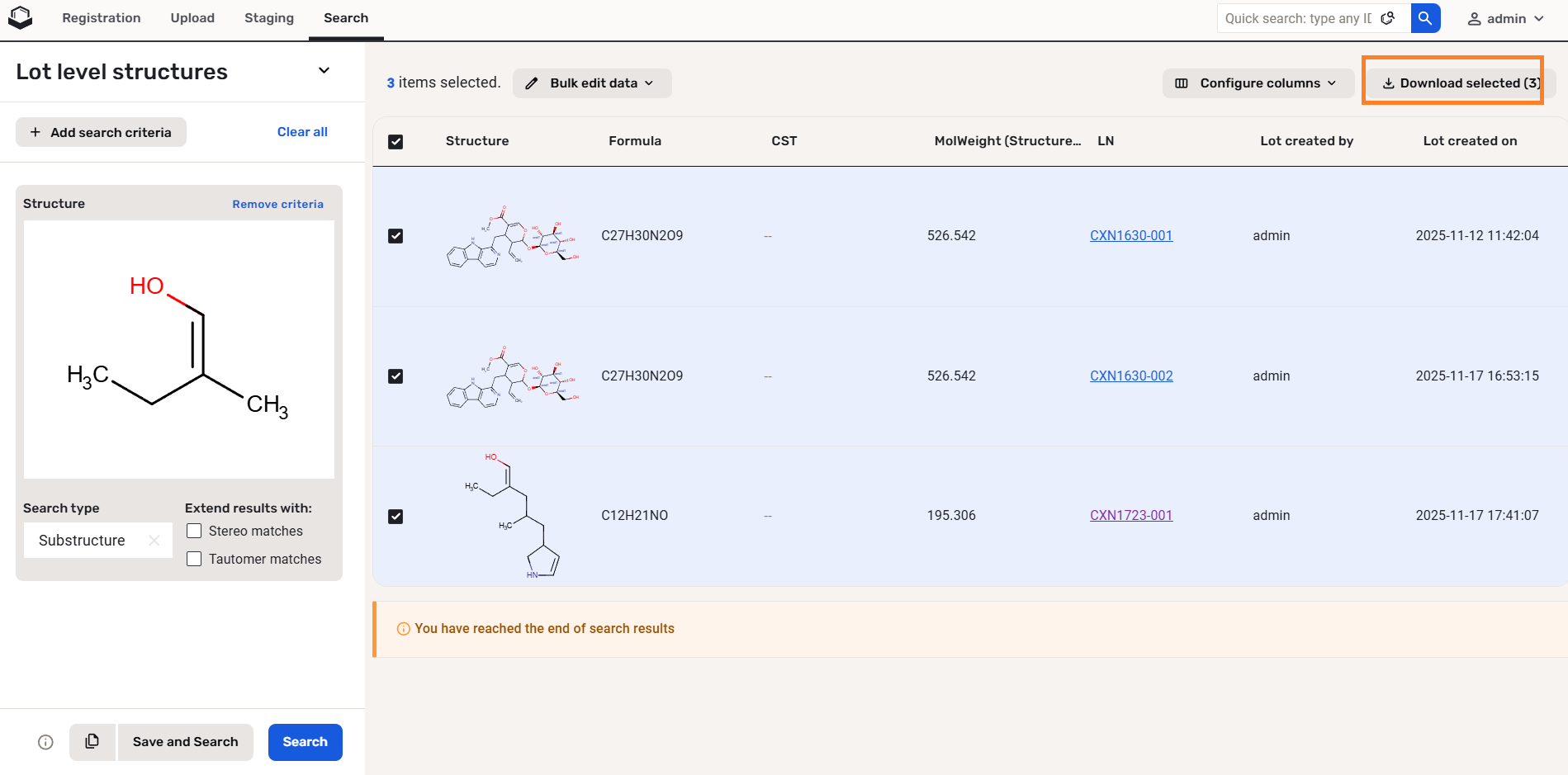 The registration system enables data export in a SD file format. Beside the structure, the salt info (salt/solvate name and multiplicity), the restriction level, PCN, CN, LN, LnbRef, Project, CST, MolWeight, Formula, additional data etc. (configurable) can be exported. Data export can be performed from the Search page using the Download selected button.