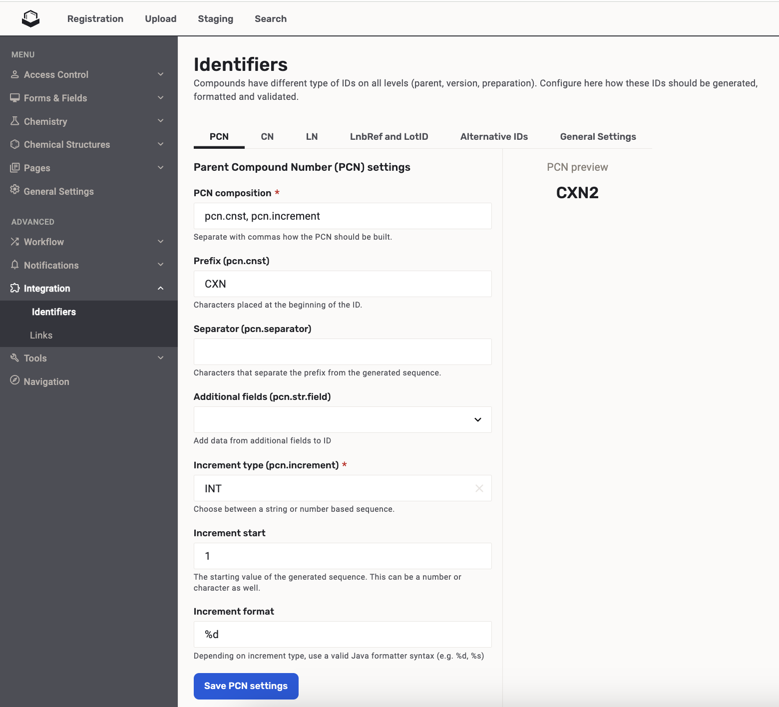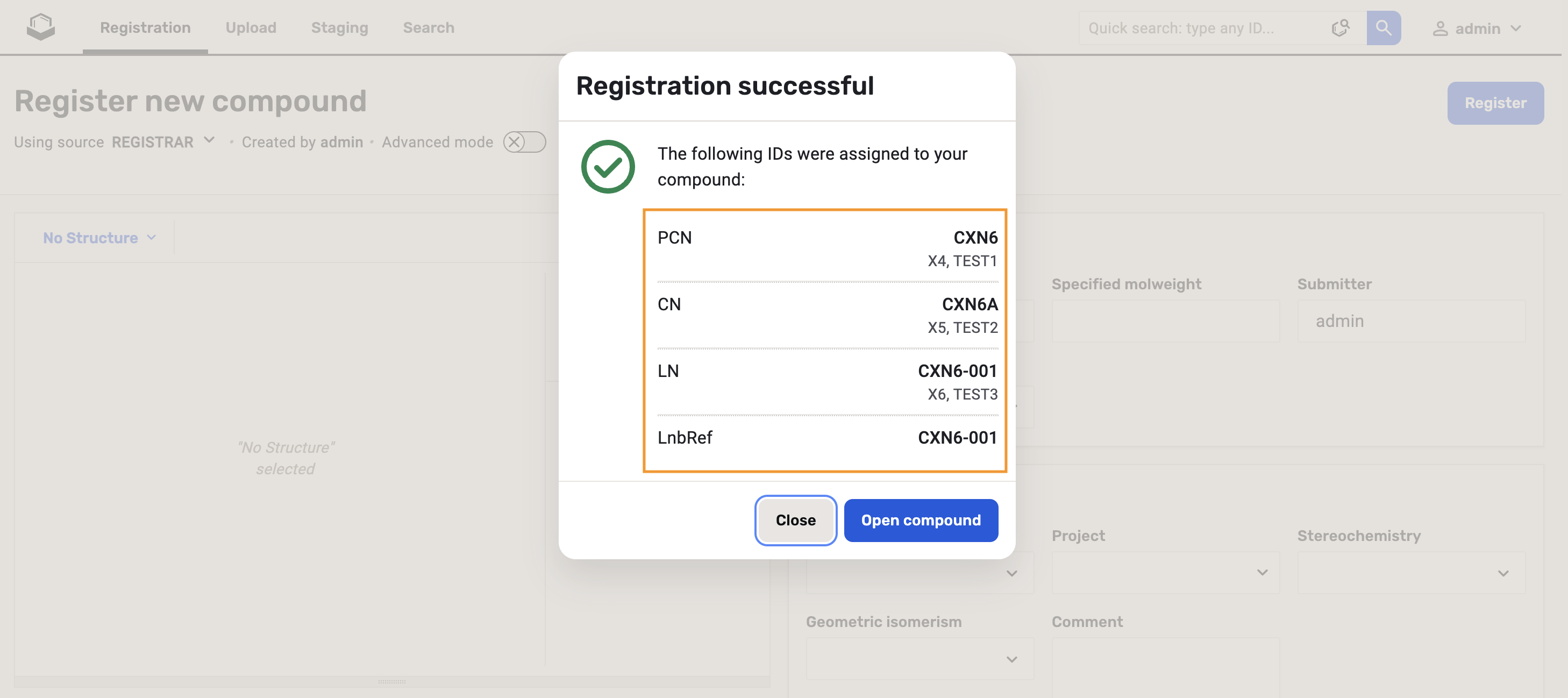 Since version 24.3.4 Secondary (alternative) identifiers can be configured on the Administration page to be assigned to the registered compounds.