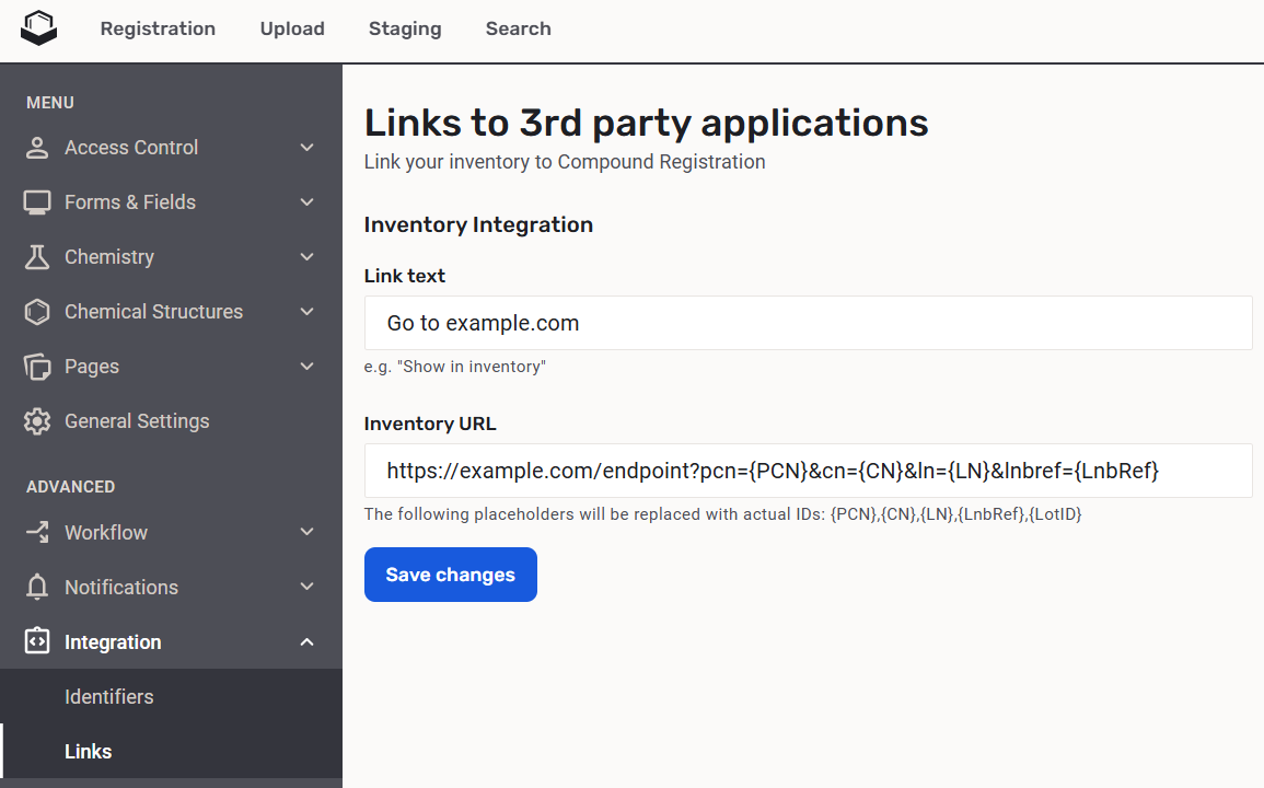 The Inventory URL value can contain the following placeholders which will be replaced with the actual IDs of the selected lot: {PCN}, {CN}, {LN}, {LnbRef}, {LotID}