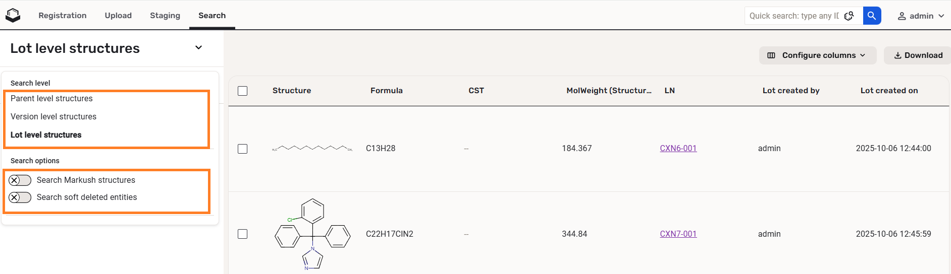 Since version 24.3.3 the search conditions can be saved separately for all 3 levels (parent, version and lot). The Search options (Markush search, Deleted search) are also saved.
