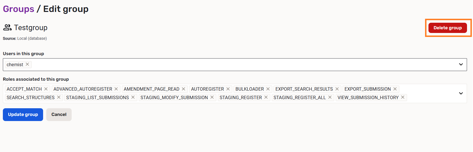 In the case of local groups, the Users in this group and Roles associated with this group can be set here. Local groups can be deleted here with the help of Delete group button.
