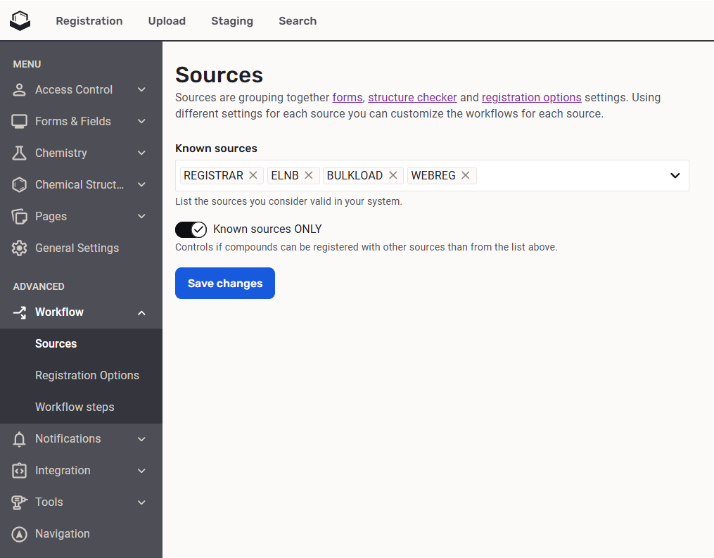 After defining a new source, the administrator should define a registration form for the given source and a set of structure checkers and the list of registration options. In order to make the new source the default selection during single registration and bulk uploads, drag and drop it to the beginning of the list of Known sources and save your changes.