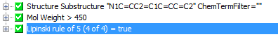 ) to open the Chemical Terms editor which will allow you to enter the expression or use one of the pre-defined favourites. This filter is applied to each result of the search and used as an additional filter for the search results. An example would be to retrieve only structures that have a logP of less that 5 by entering the expression
