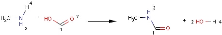 Structures to the left of the reaction arrow are reactants (starting materials), structures to the right of the reaction arrow are products, and those molecules drawn just above or below the arrow are agents (ingredients). Corresponding atoms containing changing bonds (created, destroyed or modified) are marked with map numbers both in the reactants and in the products (Table 1.).