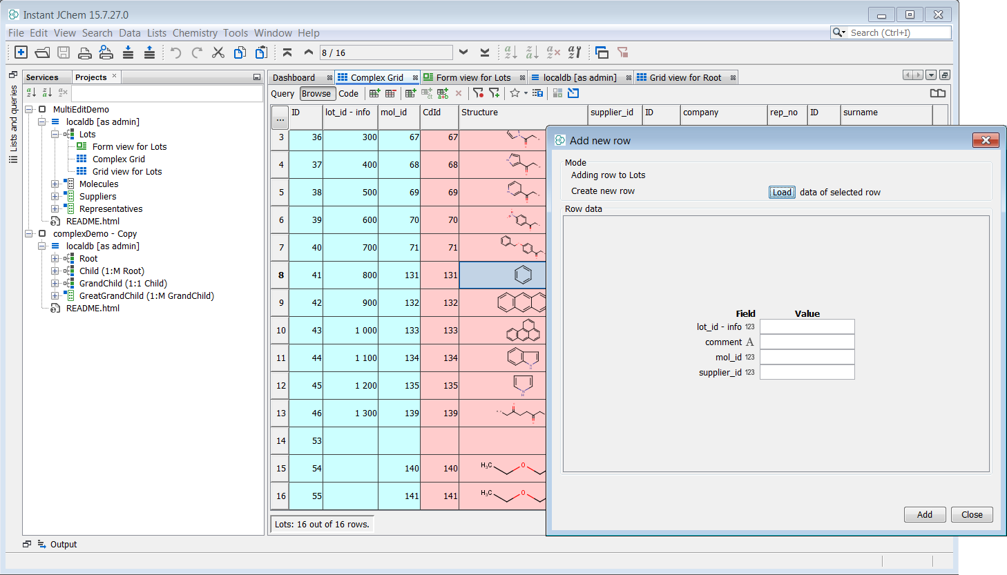 You can follow the instructions on how to add a new row into the root described previously. In the example below, four new benzene lots were added, two of them supplied by Company1 and the remaining two by Company2 and Company4 . In the ‘Add new row’ window, the ‘load data’ button was used to select the data from the row containing benzene. Then, the lot numbers were changed for each row inserted and the supplier_id was changed for third and fourth row to 2 and 4, respectively. You can notice that four rows with the same CdID have been added, two of them containing also the same supplier_id.