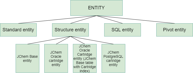 There are four subtypes of structure entities. JChem Base entity, JChem Oracle Cartridge entity, JChem Oracle Cartridge entity ( JChem Base table with Cartridge index) ( Documentation page about the JChem cartridge table types in IJC can be found here.) and JChem PostgreSQL Cartridge entity. |
