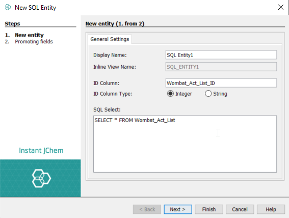 - In the ID column field, specify the column name for the identity column (primary key column) in the database table. For a JChem PostgreSQL Cartridge entity, the ID is generated automatically.