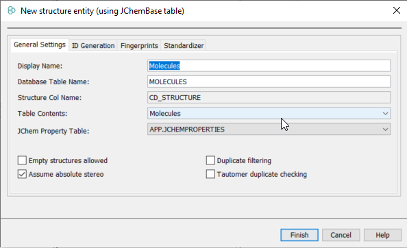 In the General Settings tab, the entity name and the database table name appear. In case of structure entities, the JChem property table settings become visible as well as flags for allowing empty structures and duplicate filtering and flags for stereochemistry settings (assume absolute stereo and tautomer duplicate checking). Documentation of JChem stereochemistry features can be found here.