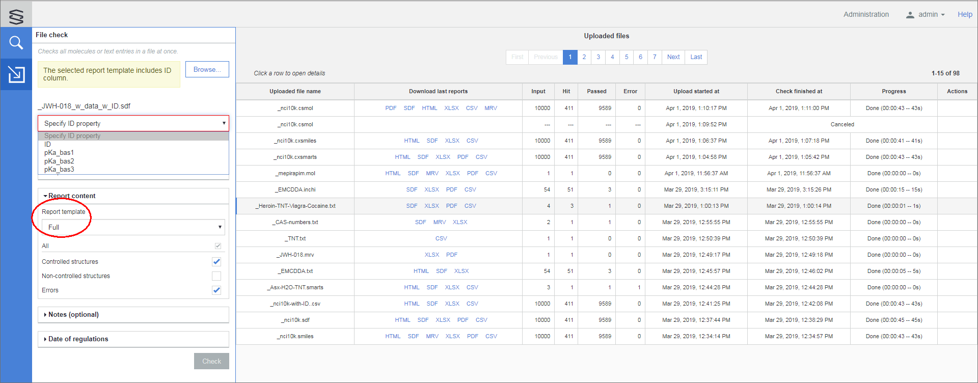 | In the Download last reports column the icons of the already generated PDF, HTML, SDF, MRV, XLSX and/or CSV reports are displayed. Click the corresponding document icon to download the file. |