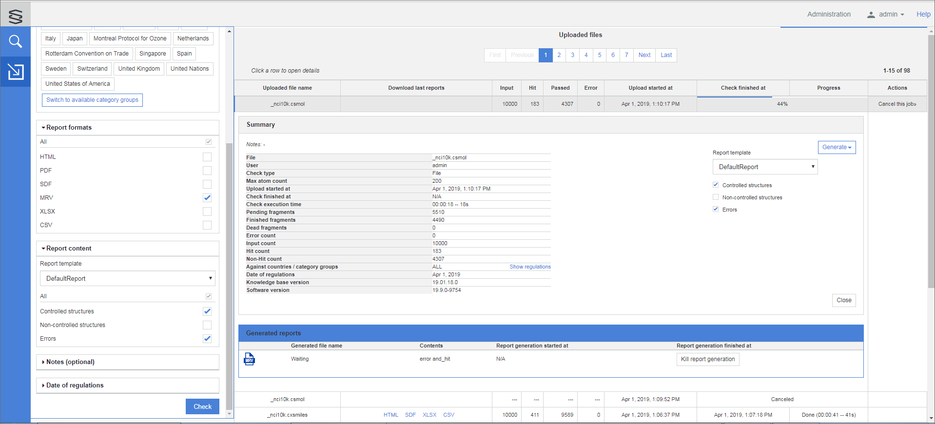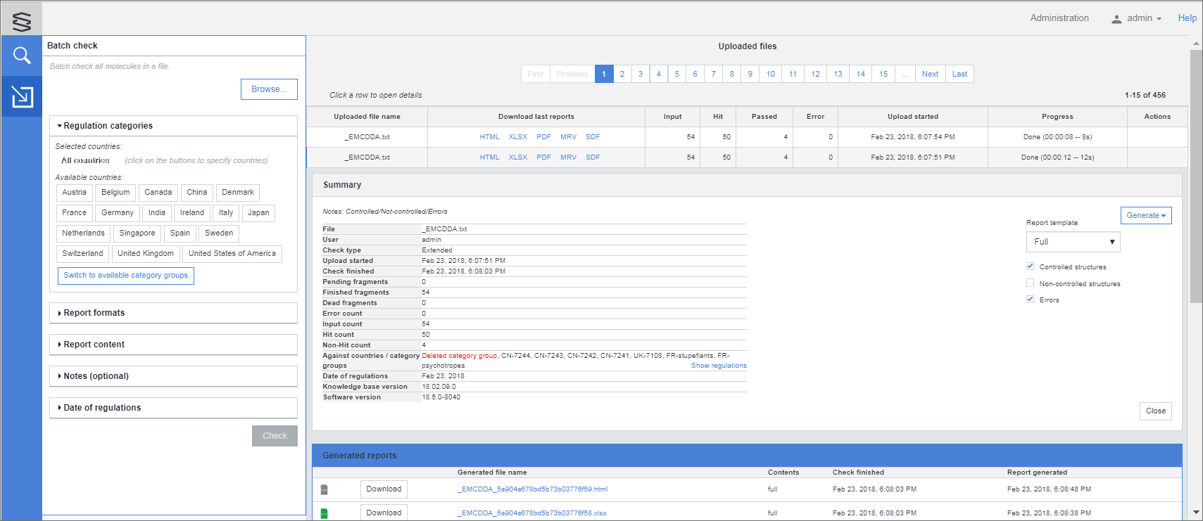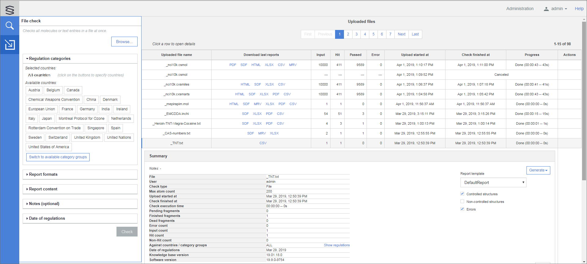 A set of substances can be checked via the File check where a single file containing all the substances is filtered for controlled substances.