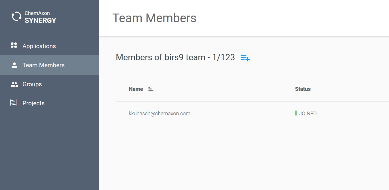 After logging in to Chemaxon Synergy, the Team Administrator can access a tab named **Team Members. ** After selecting it, they can see the number of users they can invite, the already invited users, and whether or not those users have joined already: