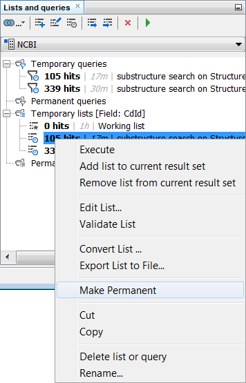 The queries can be handled in a very similar way, just the number of options is much more limited. We will make both temporary queries permanent by choosing the *Make Permanent * option in the right-click menu. Subsequently, we will rename them to “pyridine < 200 MW” and “pyrrole < 200 MW” using the right-click menu *Rename … * option to match with the corresponding lists.