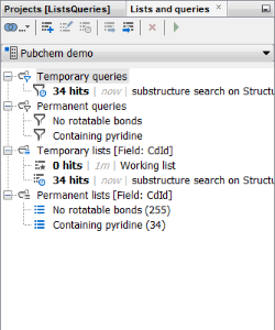 If you switch to the Lists and Queries panel, you can see a new temporary query, accompanied by a new temporary list, has been created. You can rearrange the windows by dragging and dropping using the named tab. You can notice that the number of hits corresponds to the “Containing pyridine” permanent list included in the demo data (and that is good as we searched for pyridine!).