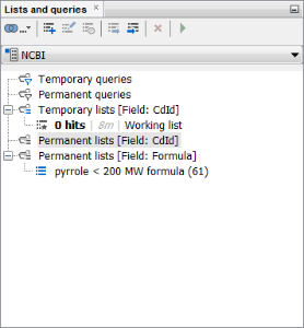 Let’s now close the Pubchem gridview and open the NCBI entity gridview. Now you can see there are neither temporary nor permanent lists or queries in the Lists and queries window, as this window shows only the lists and queries for the selected data tree.