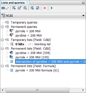 Let’s start with creating some temporary queries for the NCBI data tree. First, we can run a Substructure search for pyridine and add a condition of molecular weight below 200. A new temporary query and temporary list have been created for 339 hits.