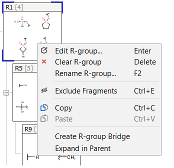 You can edit R-group definitions or individual fragment definitions by right-clicking or double-clicking on the tree node or the selected fragment. From the context menu, you can select the Edit function or you can add new fragments or remove existing ones.
