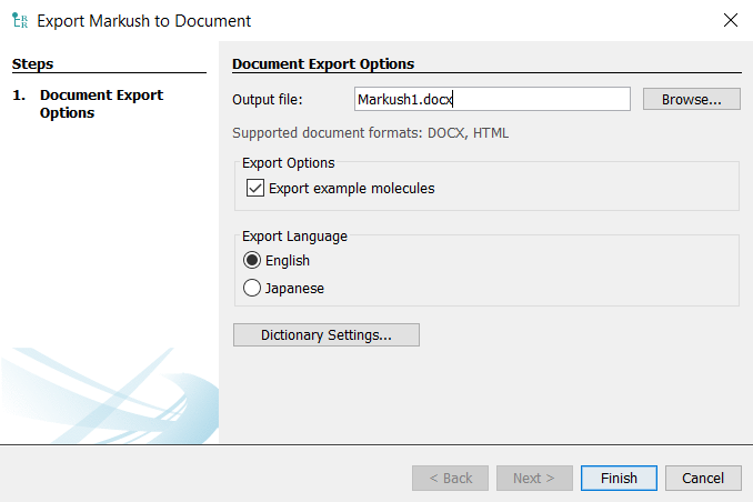 It is possible to generate a Japanese language example list and claim draft by selecting the Japanese button. Japanese chemical name and structure conversion license is required to export to a Japanese language document.