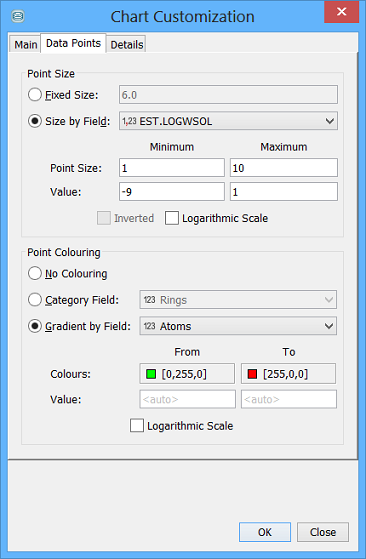 - You can chose colouring by the numeric value of a field. Gradient is set automatically within the range of all values between two customisable colours. The colours can be change by clicking on them. When the range is explicitly specified, all values falling out of the range will be treat as having a boundary value. Gradient among colours can have logarithmic scale. How does it look can be seen in Feature Parade for Instant JChem 5.6.0 .
