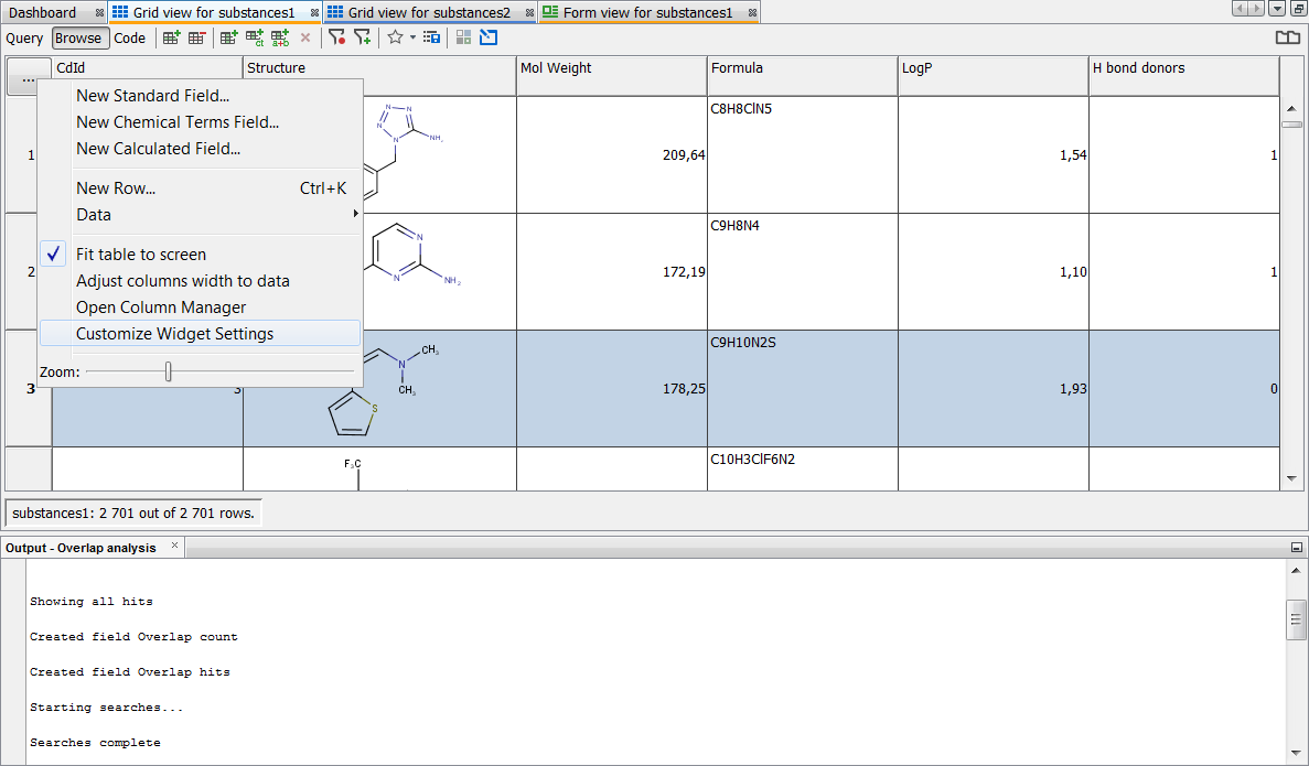 After the importing process has finished, the default grid view containing the molecules and the corresponding fields is shown.