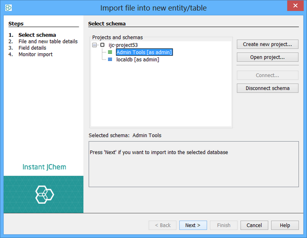 Import into an existing database table, adding the data from the file to the data that already exists. The distinction is important, and in IJC 2.4 we made a change to how the import action works to avoid the risk of importing data into an existing table by mistake. Normally import works by creating a new table and importing the data into it. The File menu items, the toolbar icons and the right click menu item on the schema node in the projects window all work in this way. If you want to import data into an existing table you must use the 'File import...' action in the right-click menu on the data tree in the projects window. Note the two screenshots below. In the left hand one we are importing a file into the localdb schema as a NEW table, whilst in the right hand one we are importing the file into the EXISTING Pubchem demo table.
