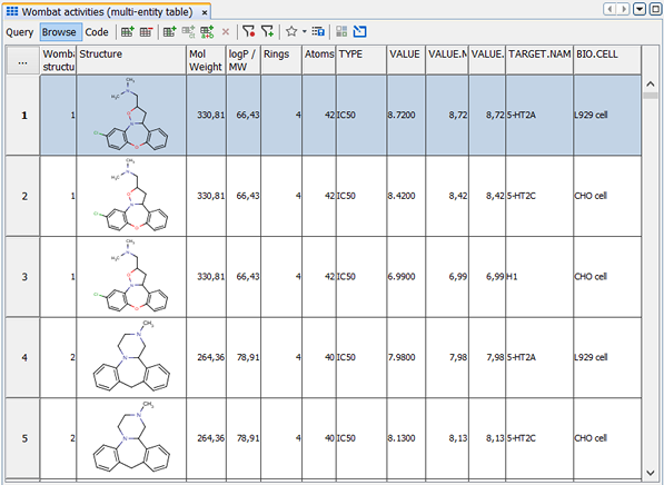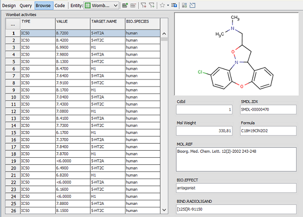 Data can be viewed in the main window. IJC currently supports two View types, the Grid View in Instant JChem, which emphasizes data display from a single database table, and the Form View, which gives more focus to a single record within an Entity. Views belong to a Data Tree, and multiple Views of a Data Tree can be open at the same, with content selection automatically being synchronised between Views. Similarly, if you run a query or change the sort directives then all Views belonging to that Data Tree will update.