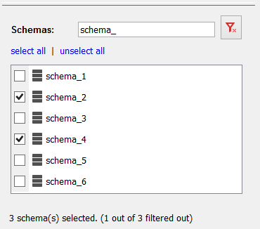 Here the schemas can be selected. In case of having multiple schemas in the connection, it is possible to apply a search filter as seen in the following example. Schemas can be selected by clicking the check box. The information about selected schemas and selected filtered schemas is show at the bottom.