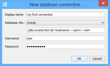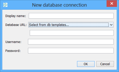 When connection details (url, user name, password) are known, the user can add connection also manually by clicking “plus connection” button images/download/attachments/1802711/add_new_connection24.png located above the list. After specifying display name, database url (you can select templates), username and password, new connection is added to the tool.