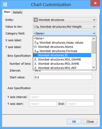 X-axis settings You can either specify a number of bins (e.g. 10 bins) and the thresholds for those bins will be determined automatically from the data, or you can additionally define the start value and the bin interval (the width of the bin) so that, for molecular weight, you might choose to start at zero and have 20 bins of width 50. When a specific starting point and interval is specified this is always used for the histogram display. When only the number of bins is specified the ranges will be adjusted according to the data (e.g. they may change when you execute a different query).