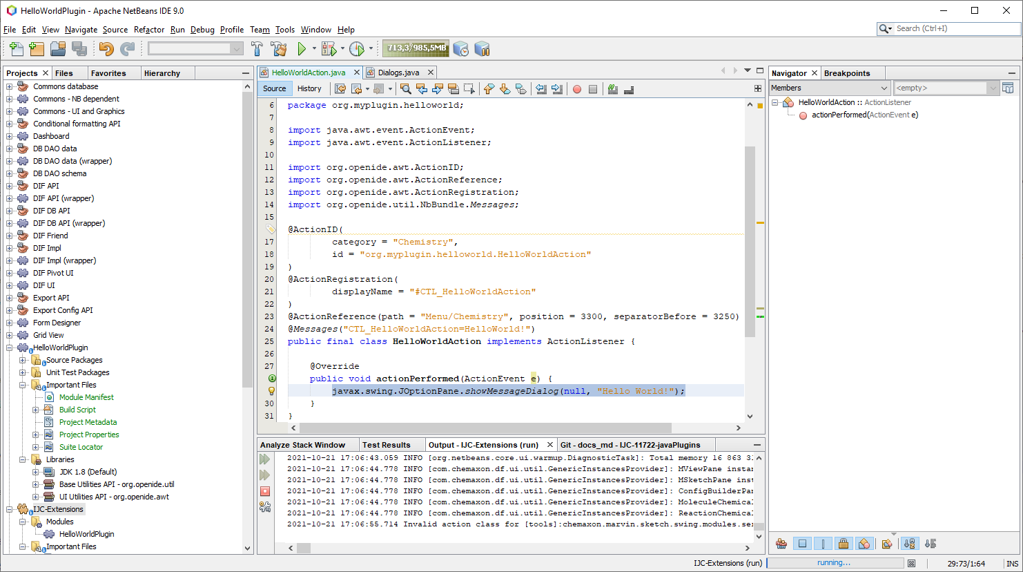 Finally, we will add some code. In the source editor find actionPerformed method in HelloWorldAction class and add javax.swing.JOptionPane.showMessageDialog(null, "Hello World!"); to its body. In the 'Projects' explorer go to IJC-Extensions suite project node, right click it and in the popup menu choose Clean and Build.