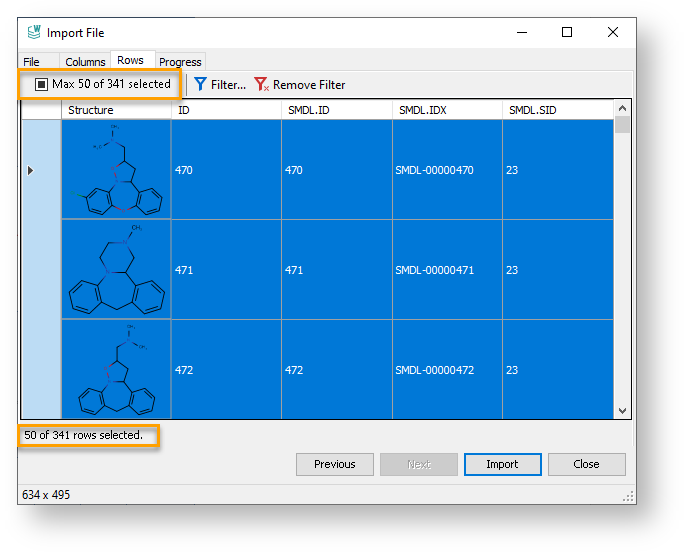 To refine the hits, click the Filter button. This opens the Filter dialog. For more information about the options, see Import from Database in JChem for Office-Query Tab.