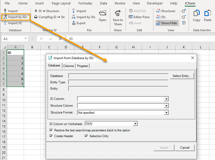 - ID Column on Worksheet: All columns in the worksheet are listed in the drop-down list. You can specify the column for which the structures and data will be searched and imported.