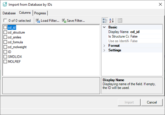 The Columns tab is the same as in Import from Database. You can specify the columns to be imported. Select at least two columns to start the import process.