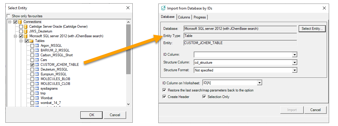 To specify the database, tables, views, and synonyms from which you would like to import the structures associated with the IDs in your spreadsheet, click the Select Entity button.