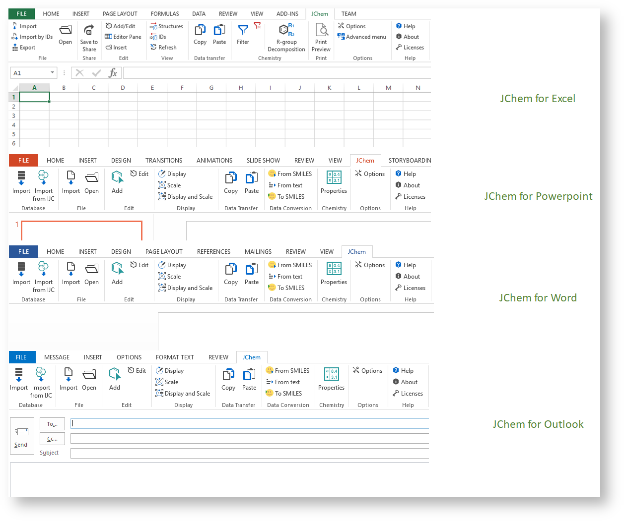 In the same process, all applications ( JChem for Excel , Word , PowerPoint and Outlook, OneNote as a prototype) are installed and the JChem ribbon is displayed in the Microsoft Office applications .