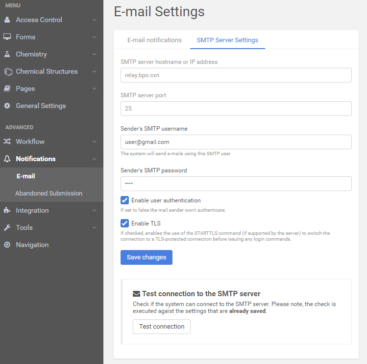 The correct settings of the SMTP server are essentials for the e-mail forwarding, but in order to be able to verify the settings, you must always save the changes first.