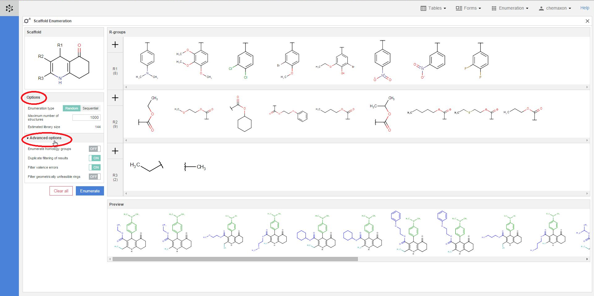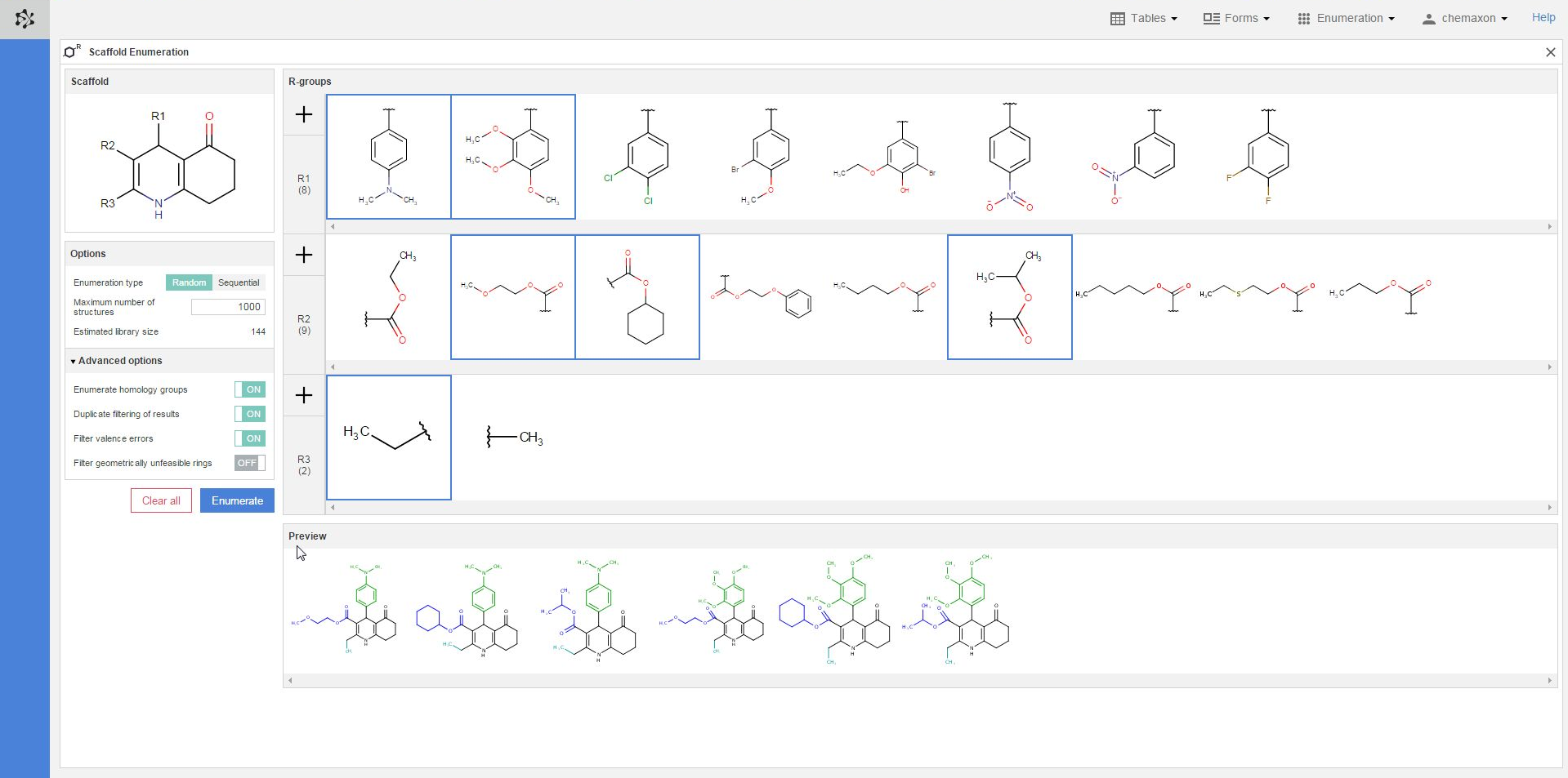 When you have finished drawing the scaffold and the R-groups, as well as have set the options you needed, the actual enumeration can be started with the blue Enumerate button. You can also delete the whole content of the Scaffold Enumeration page by pressing the Clear all button. As a result, the scaffold and the R-group definitions will be deleted, and every option will be set to their respective default value.