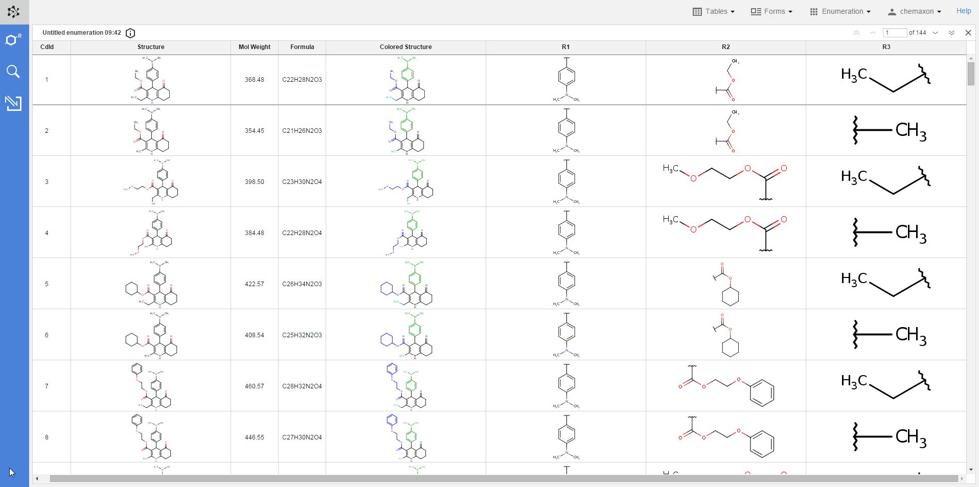 The new table will contain the following columns: the compound identifier (CdId) of the enumerated molecules, the structure, mol weight and formula of the enumerated structure, the respective substituent group for each R-atom, and the "colored structure", which corresponds to the coloring of the enumeration preview: the scaffold has black color while each R-atom substituent appears with a different color.