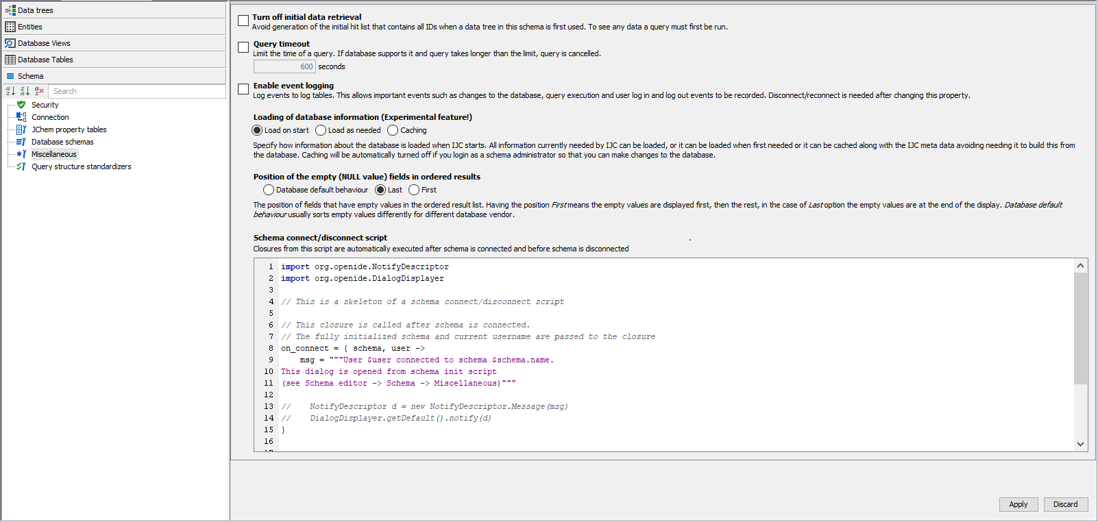 - Built it Schema login/logoff script. It is possible to execute groovy script syntax on commencement of login to a schema and/or when logging out of a schema. The first built in closure (execution block) on_connect is synchronous with the schema initialisation process. Any code added to this closure will become part of that sequence of events. Some default implementation is given (which can be uncommented and works best with a security policy in place!) which will display a dialog with the username displayed. The second closure, on_disconnect is synchronous with the schema disconnect process and again a default implementation of a simple dialog is provided. You might wish to provide your own implementation of code within these closures but blocking the initialisation of the schema should be avoided. If possible start an asynchronous thread and always catch exceptions else they may go astray. A further groovy example is given below the "default contents" screenshot.