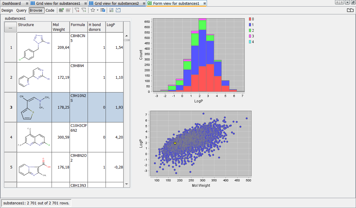 After the importing process has finished, the default grid view containing the molecules and the corresponding fields is shown.
