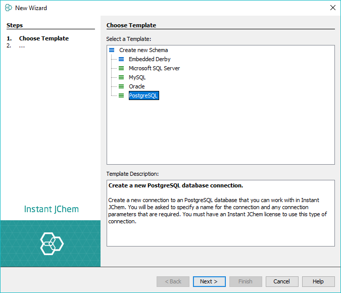 • Select a database template. This step allows you to choose the appropriate template for your database type. The Embedded Derby connection will set up a new local database. MySQL, Oracle, Microsoft SQL Server or PostgreSQL will set up a connection to a remote database.