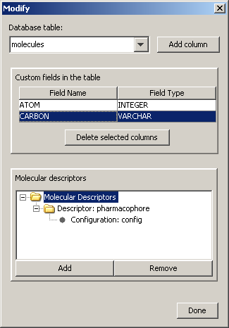 The structure table can be specified by the drop-down list found on the top of the pane. In the center there is a table which contains the custom field name and the type currently defined in the chosen structure table. To delete a custom field, select the row and click on the 'Delete selected columns' button. Molecular Descriptors and their configurations can also be seen on a separate pane. A custom column can be created by clicking on 'Add column' button.