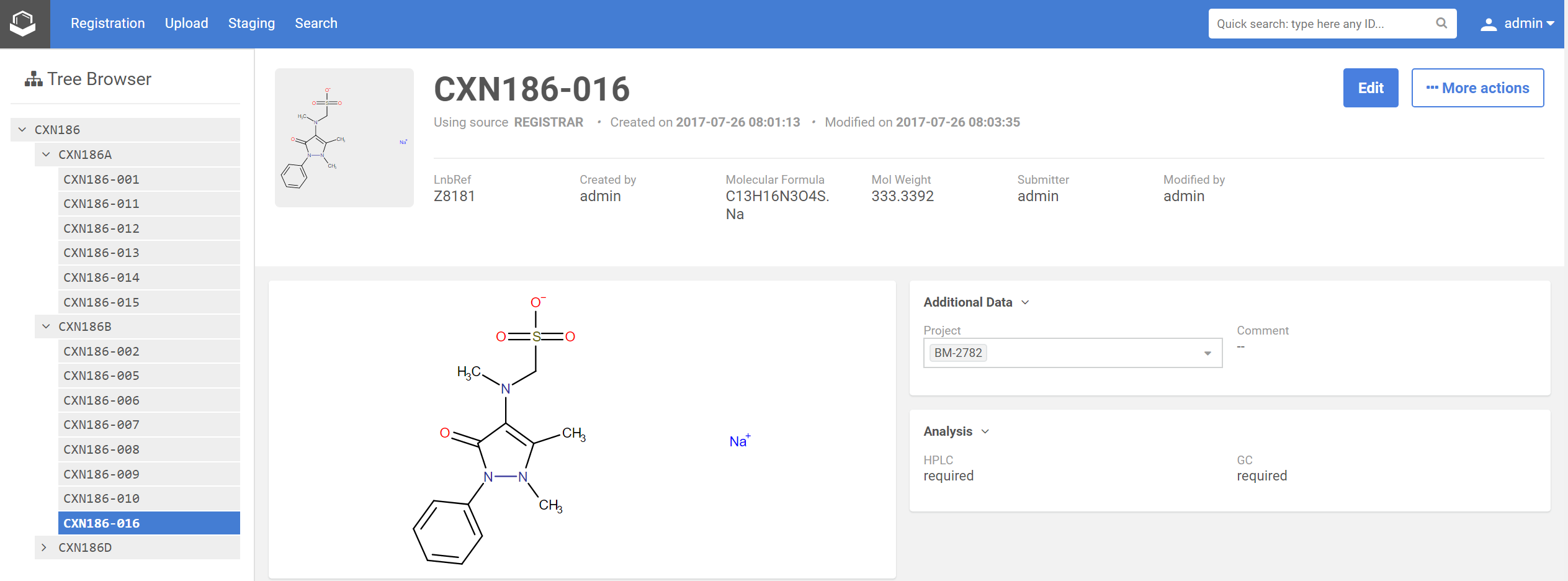 On the Browse page previously registered compounds can be viewed with all their details, data and additional data. Different types of structural and non-structural modifications can be performed in order to be saved or just to analyze the structure.