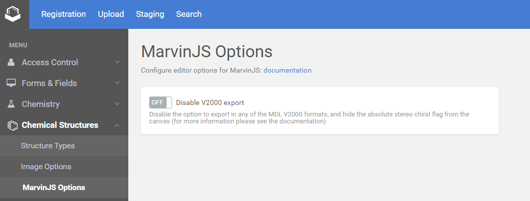 Since version 21.3.0 when using MarvinJS as the default sketcher an option to disable exporting to any of the MDL V2000 formats, and to prevent users from setting the absolute chiral flag was added. By default this option is turned OFF.