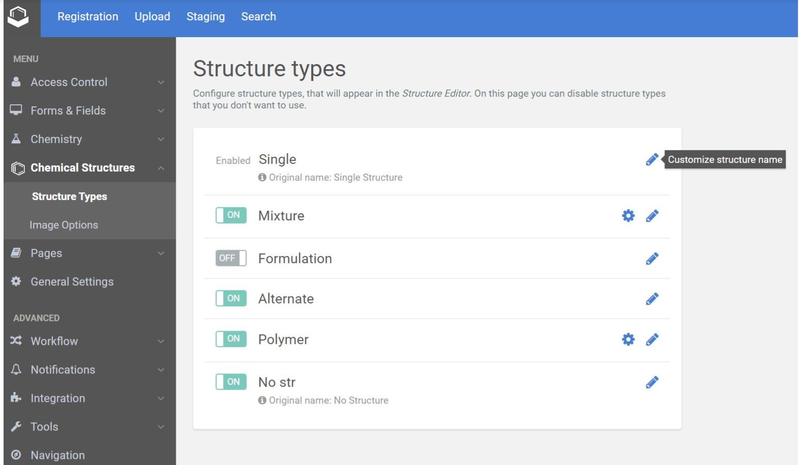 E.g. if only the Formulation structure type is "ON", the Structure Type list within the Structure Editor will contain the Single Structure and the Formulation.