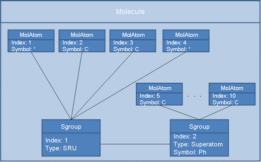 The structure contained in the S-group is represented by a Molecule object just as any other structure, since the S-group can simply be regarded as a particular structural entity within the molecule. Thus the internal representation of the Molecule is extended by two S-group objects that depict the type of the S-group and its abbreviation (symbolic name) if one exists. Each S-group object refers to its constituent atoms.