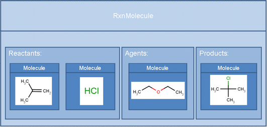 A reaction is a collection of reagents, products and agents. It is represented by the RxnMolecule object. The reagent, product and agent elements are Molecule objects embedded into the RxnMolecule object. The type of an element is defined by its relative position to the reaction arrow. The present representation is capable to express single step reactions only.